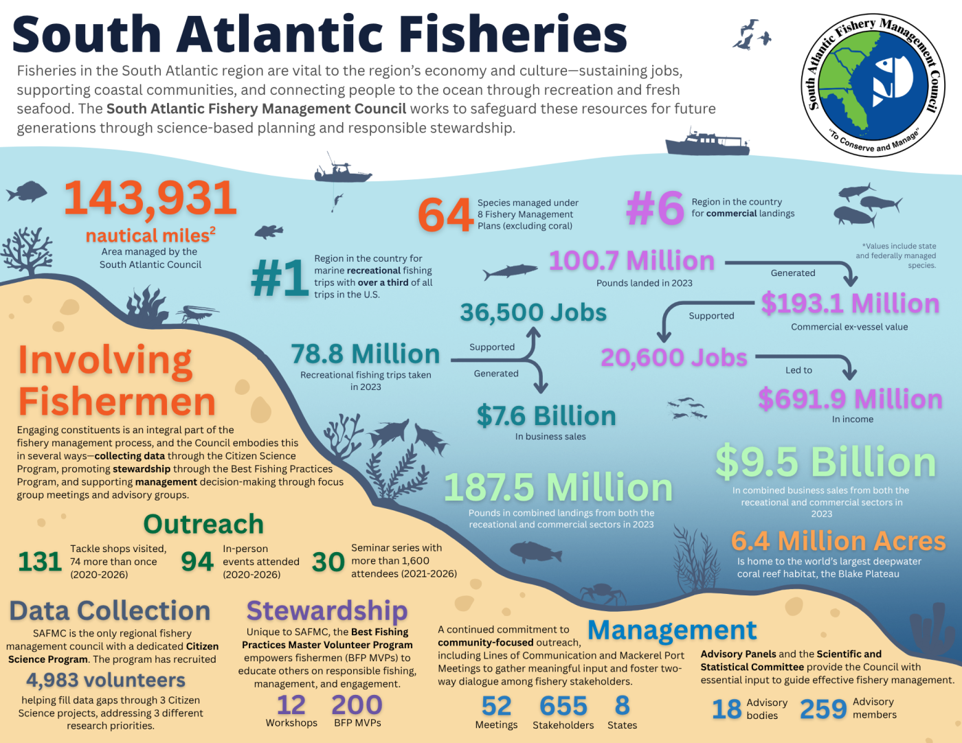 The South Atlantic Council develops fishery management plans and recommends management measures designed to ensure the long-term sustainability of the resources it manages. Specific responsibilities include: