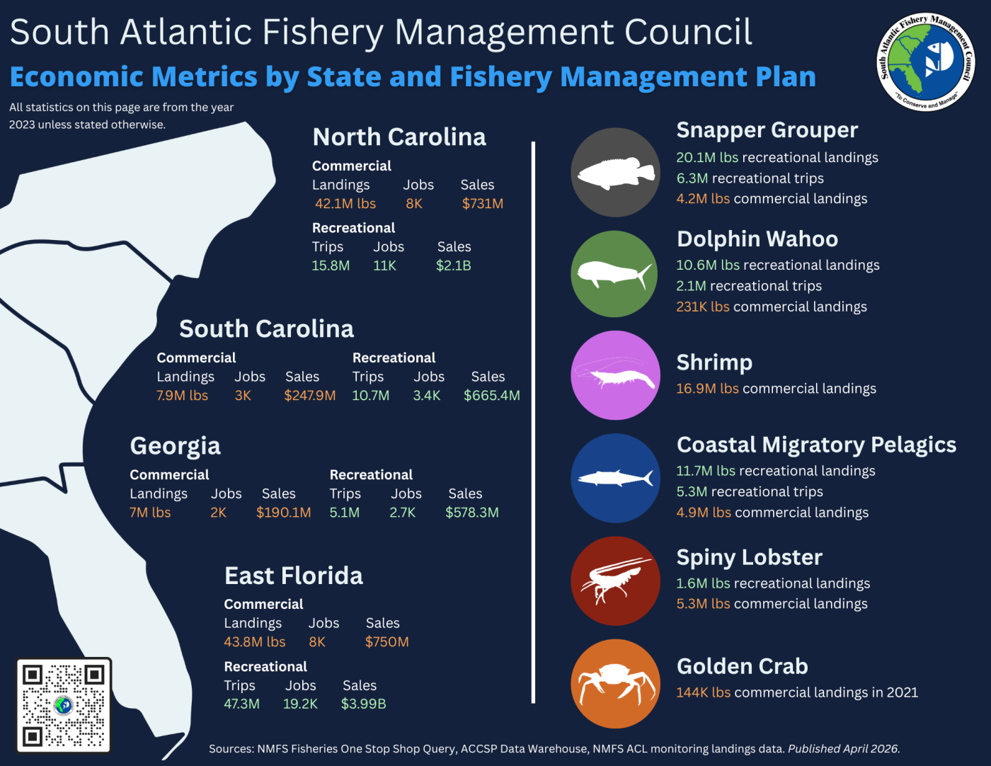 Over 64 species of finfish, crustaceans, and corals are managed by the South Atlantic Council through eight fishery management plans. The South Atlantic Council works jointly with the Gulf Fishery Management Council, Mid-Atlantic Fishery Management Council, New England Fishery Management Council, and the Atlantic States Marine Fisheries Commission to address management needs across jurisdictional boundaries.